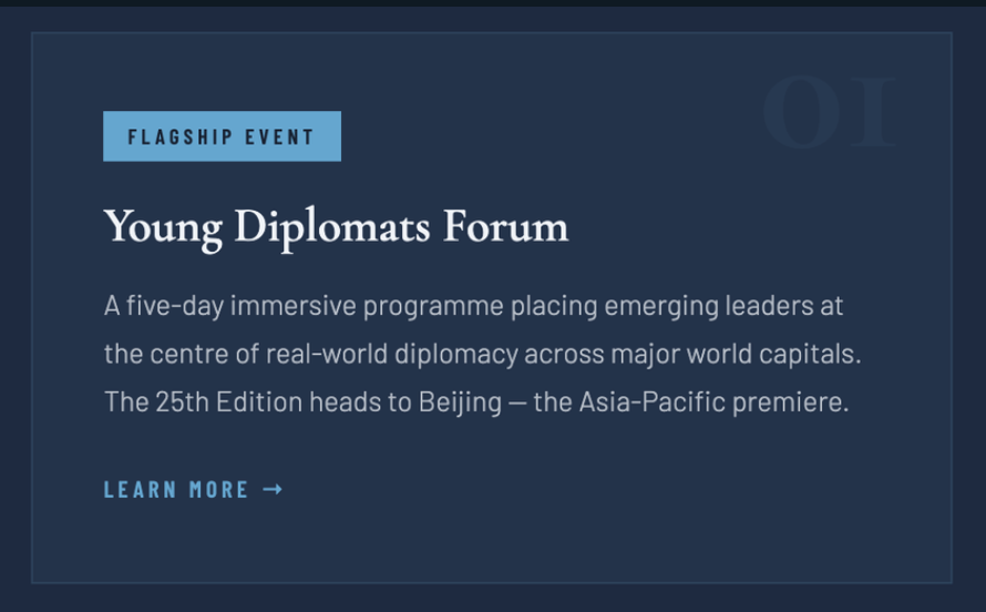 An independent, non-profit organisation bringing together emerging and established diplomats, policymakers, and international leaders from over 150 countries — through world-class training, global summits, and a community built for the future of diplomacy.