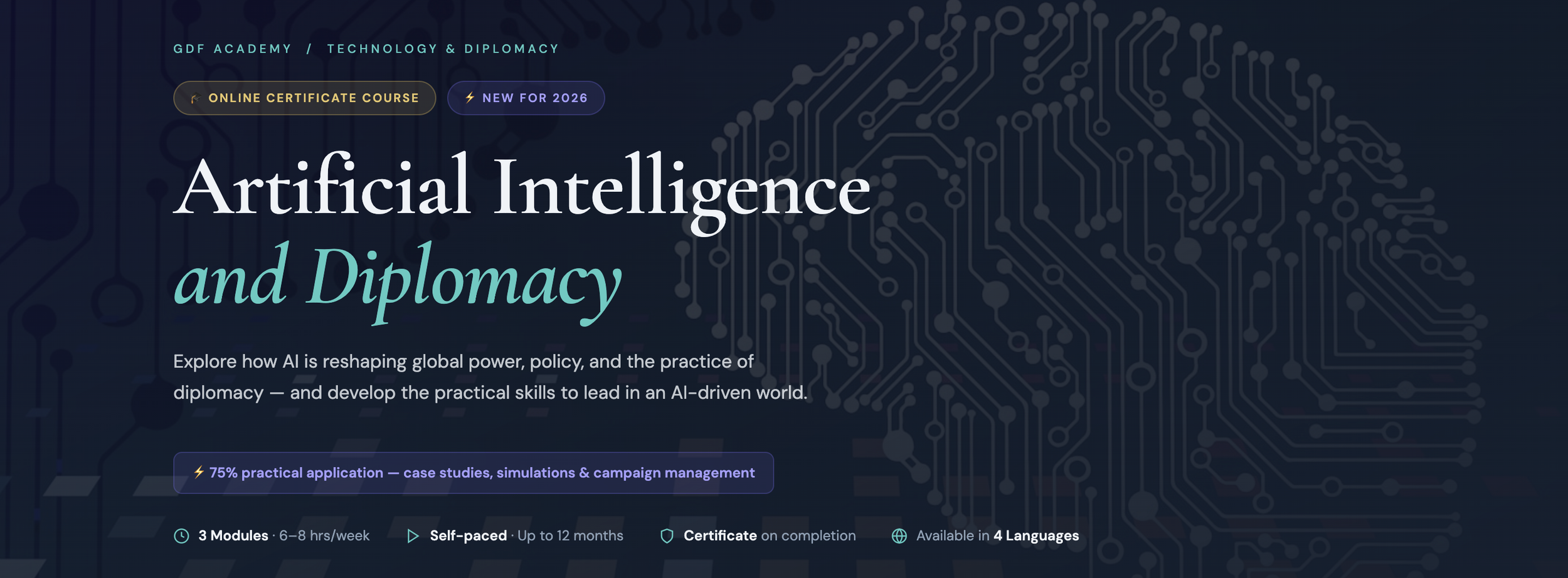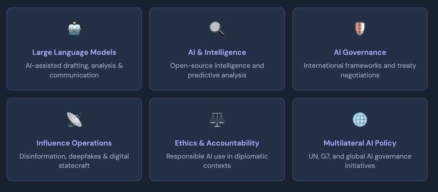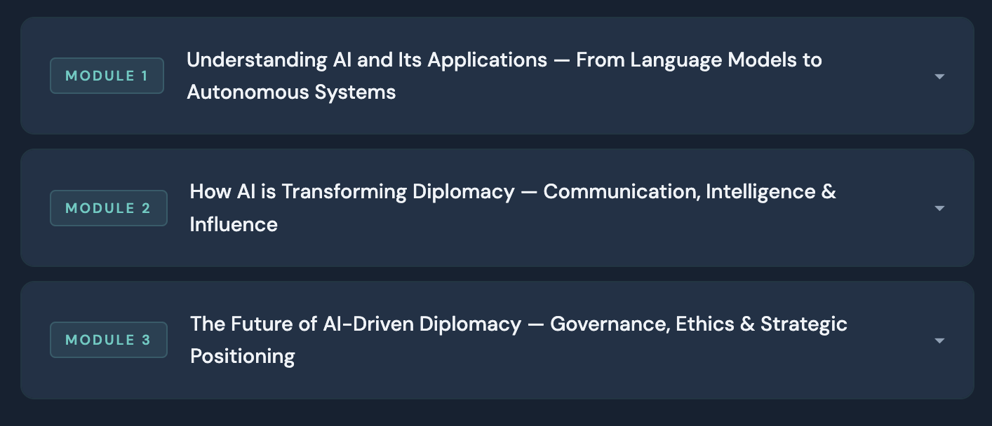 This course blends conceptual learning with hands-on experience, with 75% of the programme focused on practical applications including real-world case studies, scenario simulations, and AI campaign management exercises. Whether you are a seasoned diplomat or just beginning your career, you will leave with skills you can apply immediately.