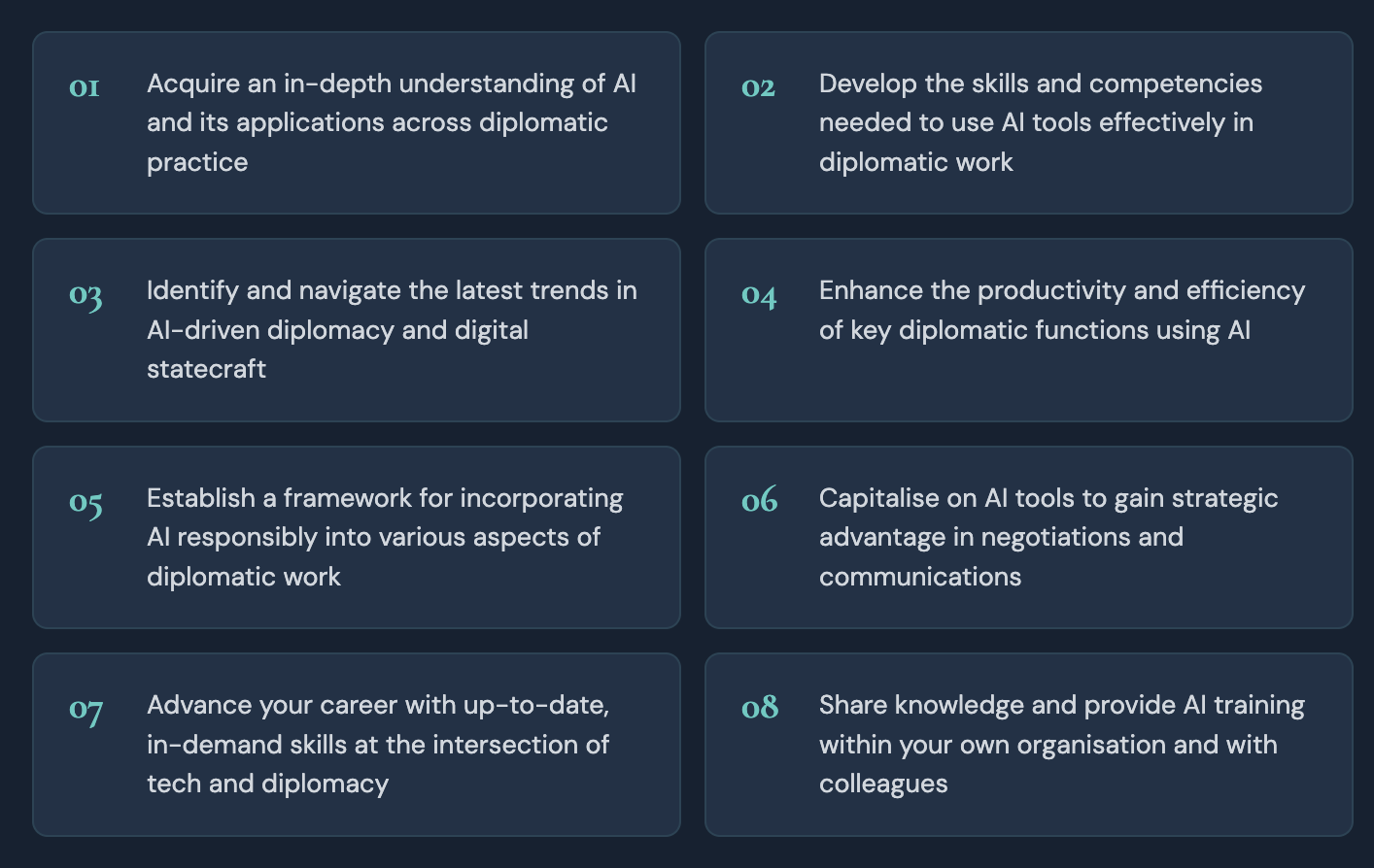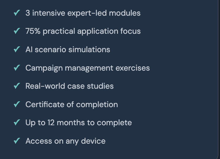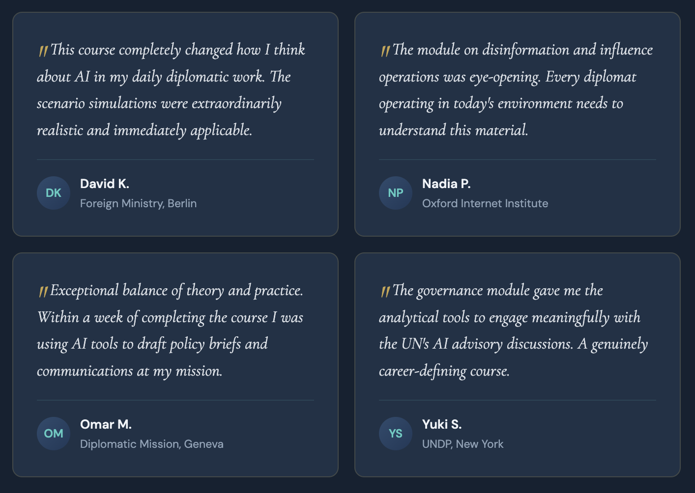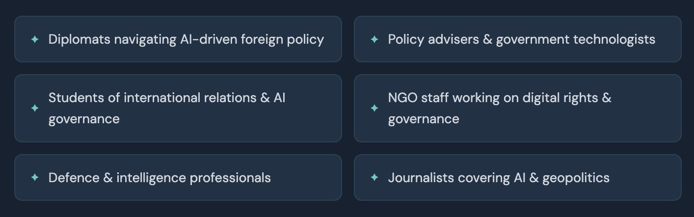 This course blends conceptual learning with hands-on experience, with 75% of the programme focused on practical applications including real-world case studies, scenario simulations, and AI campaign management exercises. Whether you are a seasoned diplomat or just beginning your career, you will leave with skills you can apply immediately.