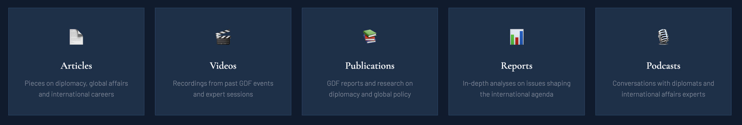 The GDF resource library is the heart of membership. It brings together a curated collection of content produced by GDF and our wider community — giving you a single place to read, watch, and listen across the topics that matter most in international affairs.