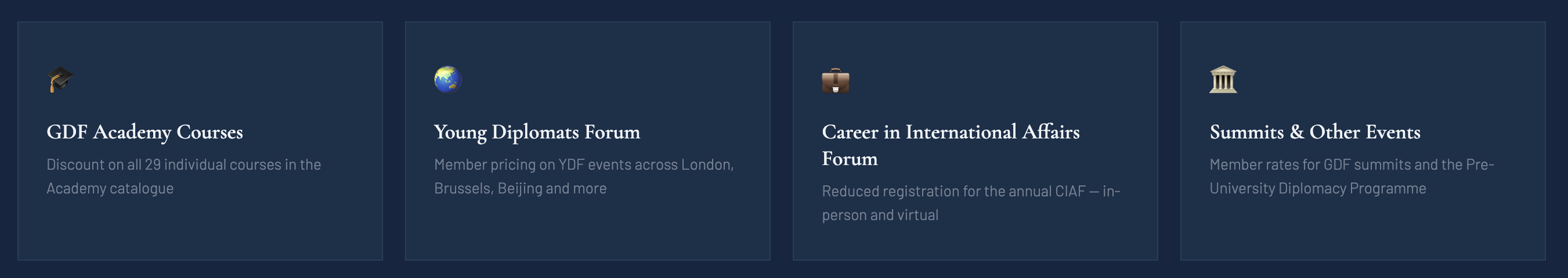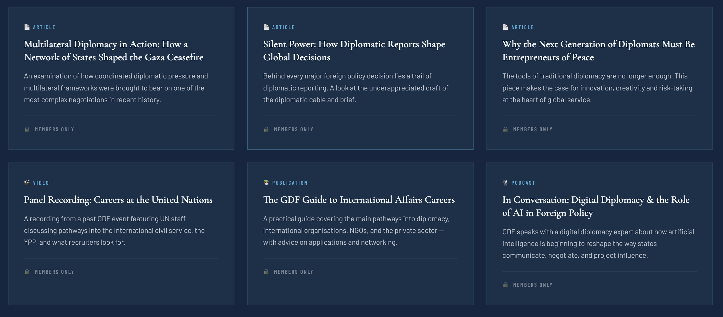 GDF membership gives you access to our growing library of articles, publications, reports, videos and podcasts — curated for diplomats, students and international affairs professionals. Plus member discounts across all GDF events and courses.
